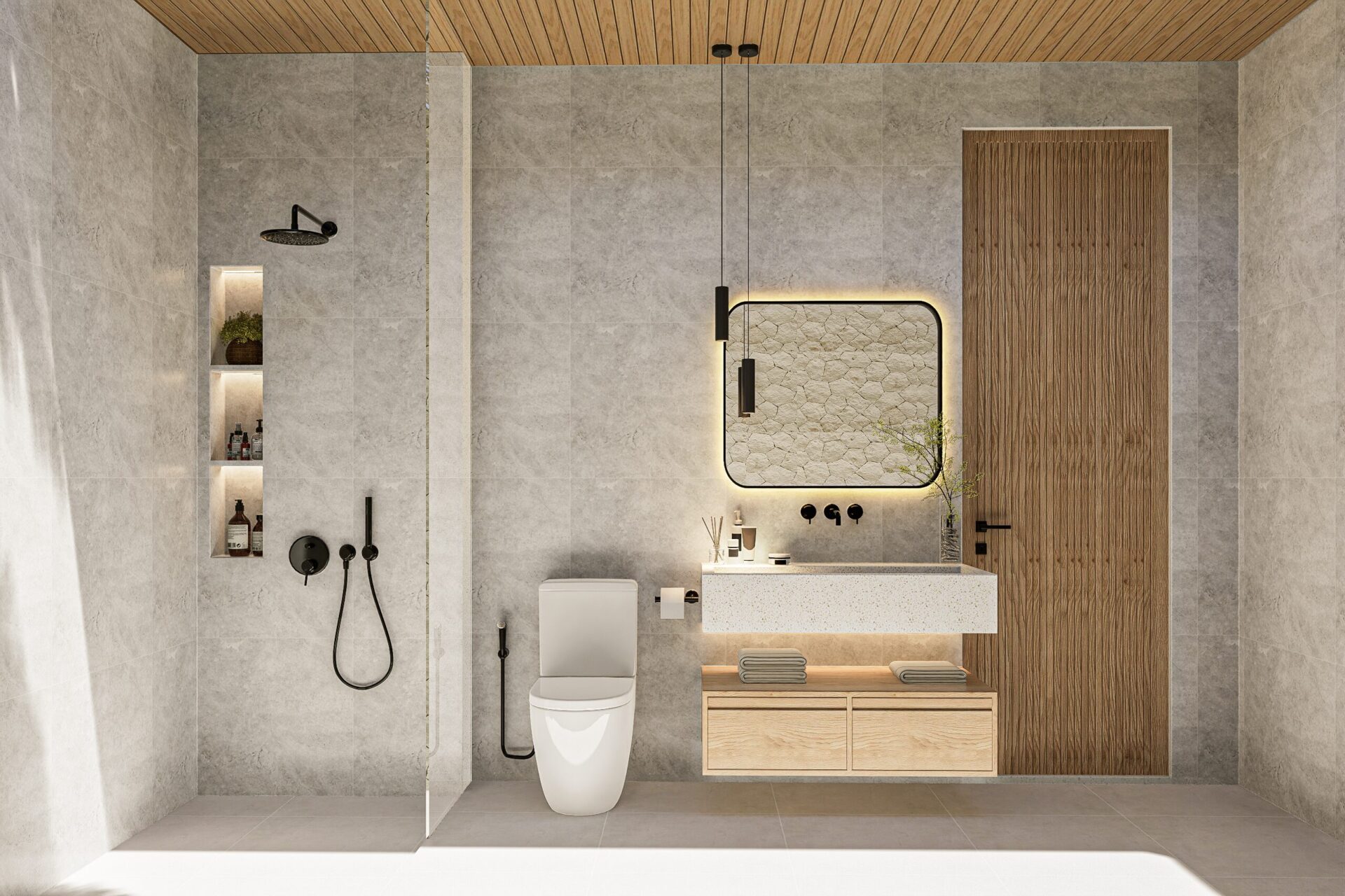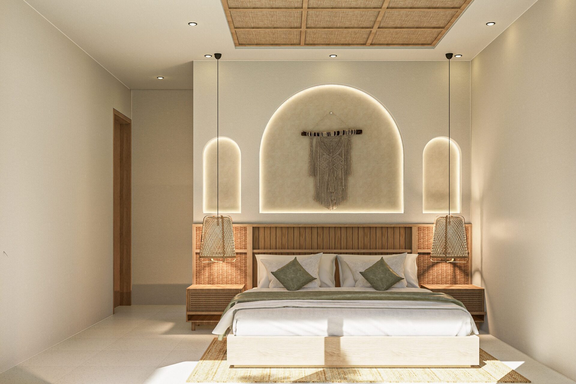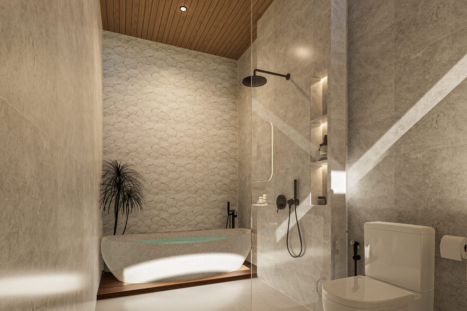 Rooted in biophilic design, every space invites light, air, and greenery to flow freely and nurtures a serene connection to the landscape. Inspired by Neo-Vernacular Balinese forms, this Balinese house architecture design speaks through textured white walls, natural stone, and warm wood tones for reinterpreting tradition with a modern, soulful language.