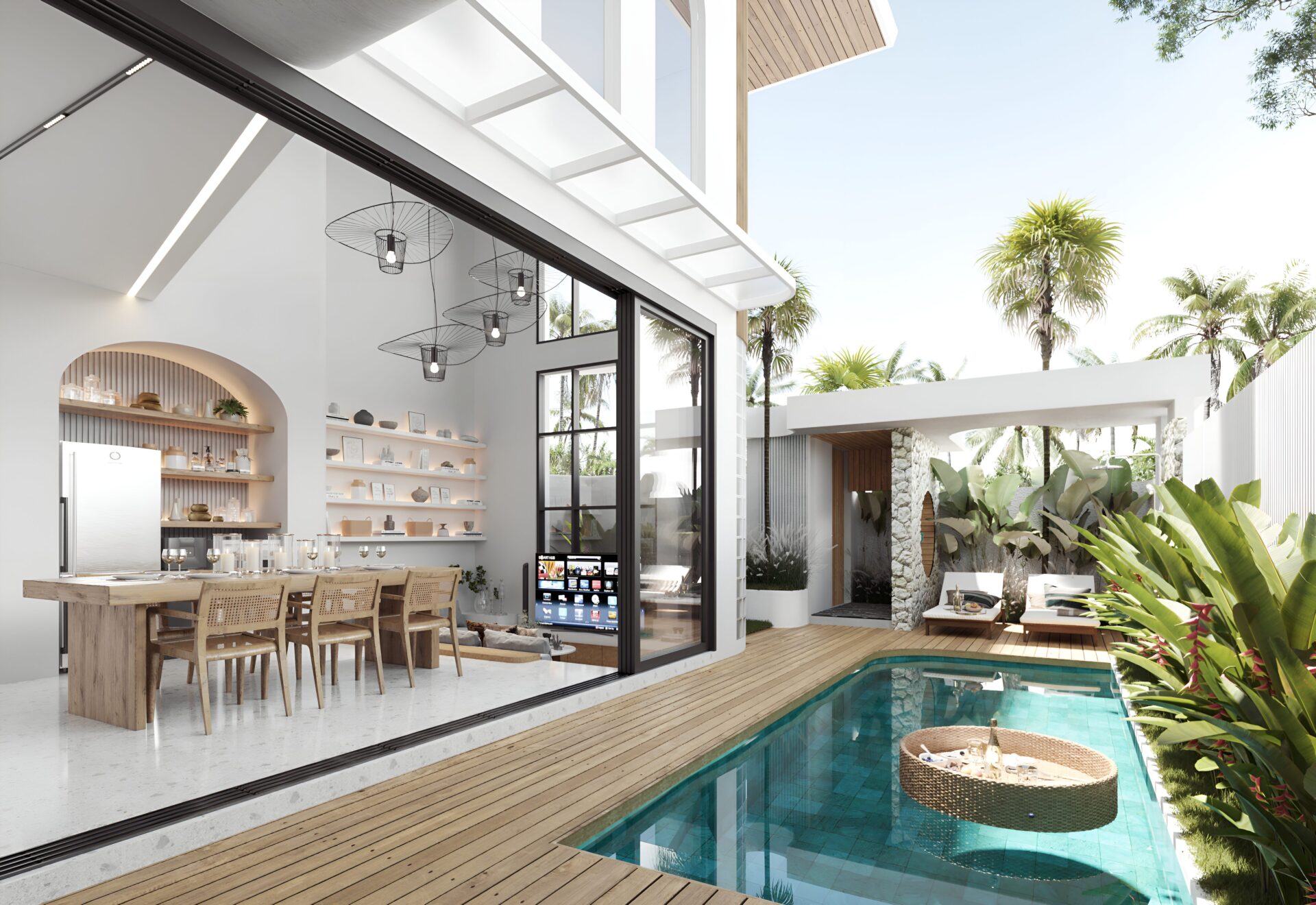 The villa's open-plan layout creates a spacious and airy feel, allowing you to seamlessly flow between the living, dining, and kitchen areas. The sunken lounge adds a touch of sophistication and provides a comfortable spot to unwind. This layout is designed to optimize both space and comfort, which is a key feature in any design villa Bali.