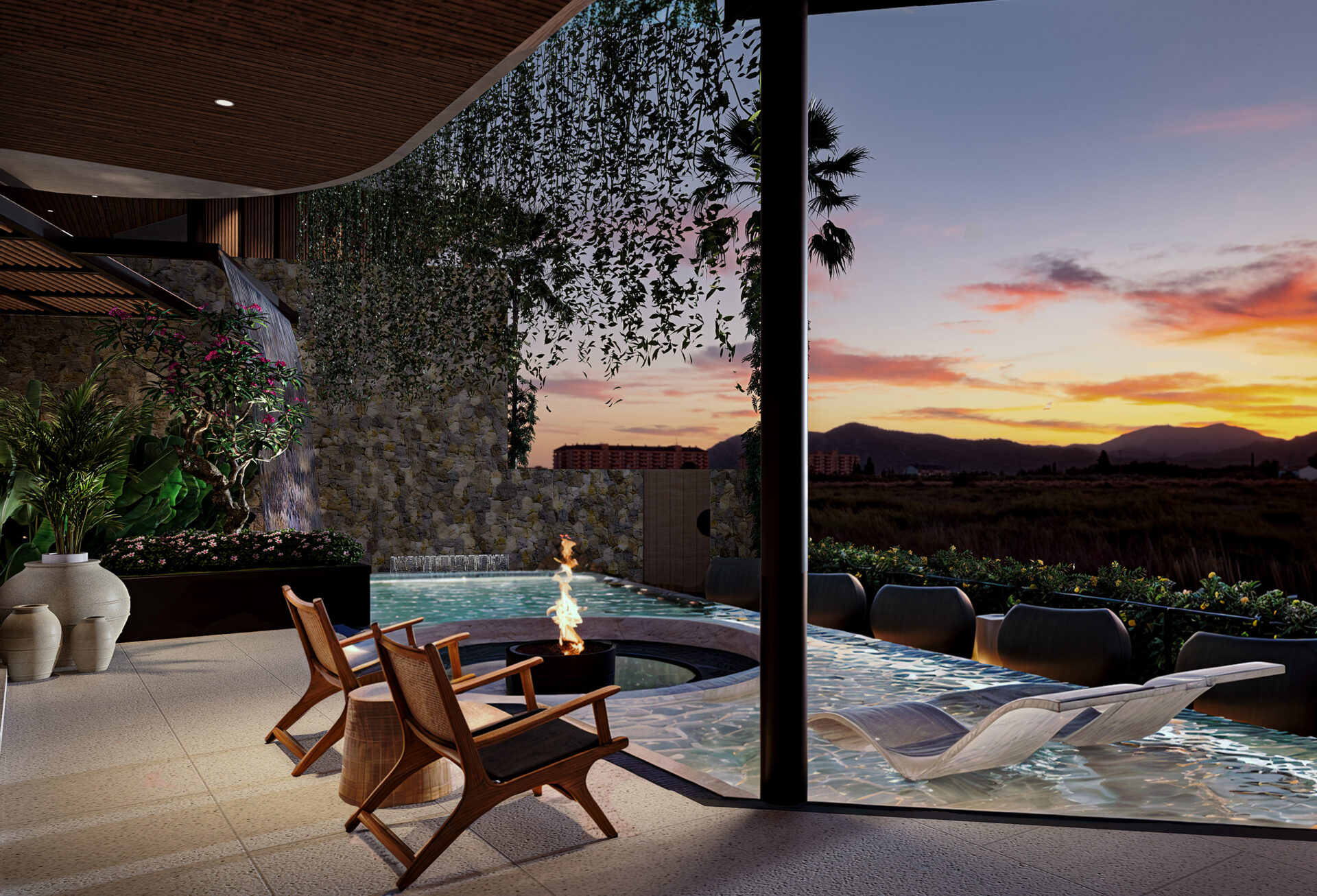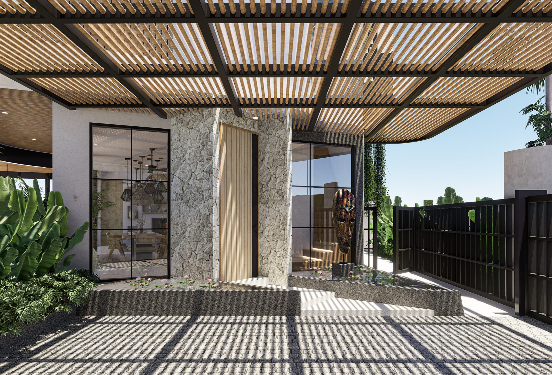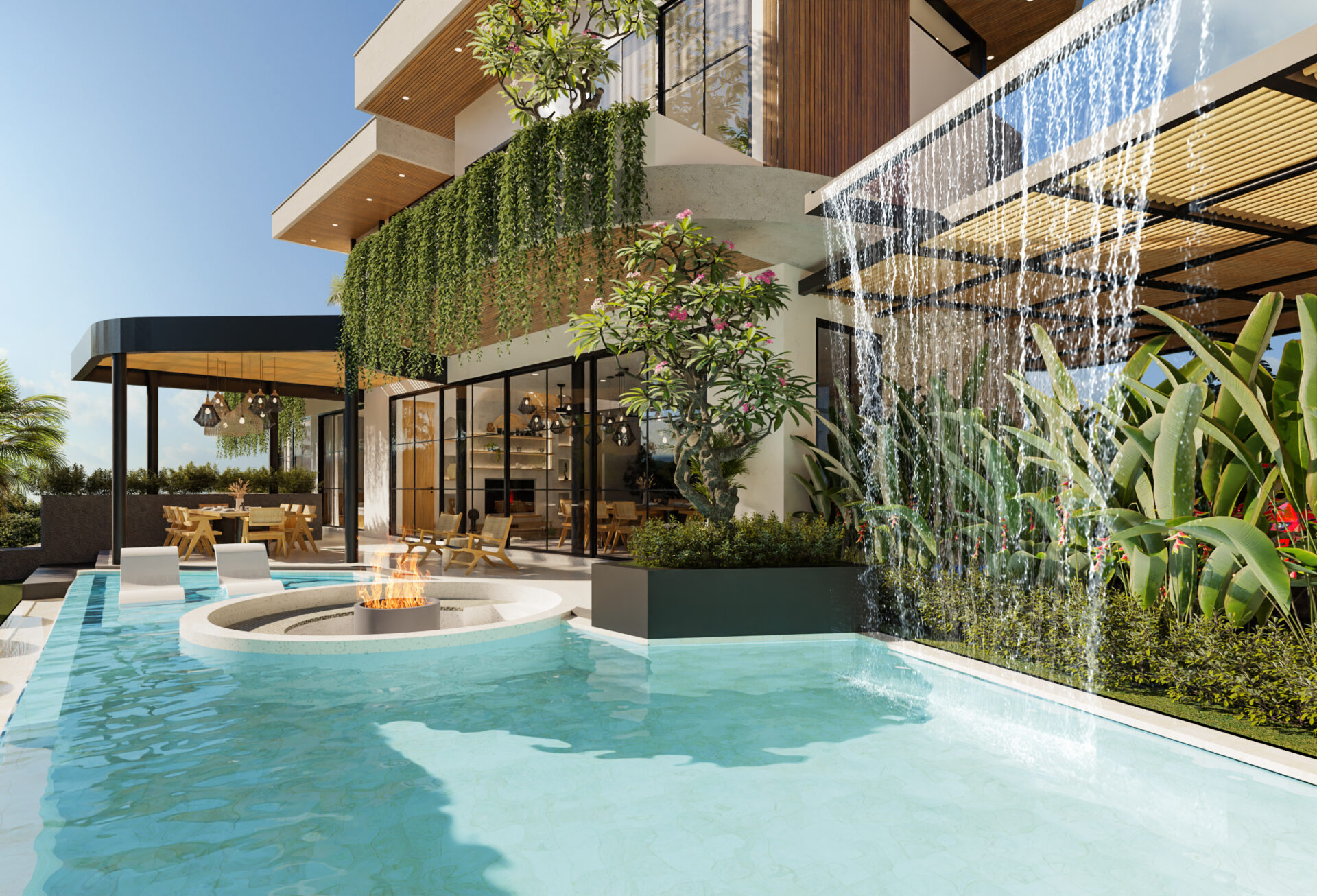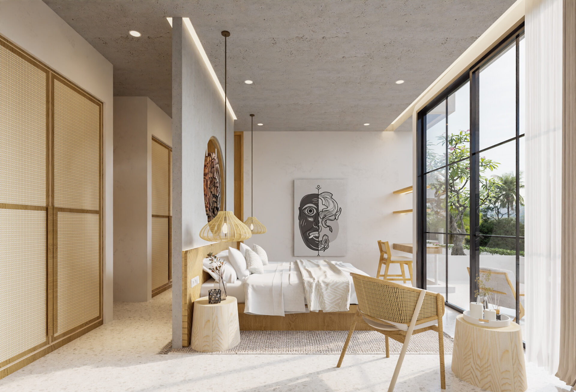 The villas are seamlessly integrated into the sloping landscape, creating a harmonious connection with the environment. Lush gardens, cascading waterfalls, and breathtaking views of Tampah Beach provide a truly immersive experience. The design embodies the principles of simplicity and efficiency, hallmarks of Bauhaus architect philosophy, ensuring that every element serves both an aesthetic and functional purpose.