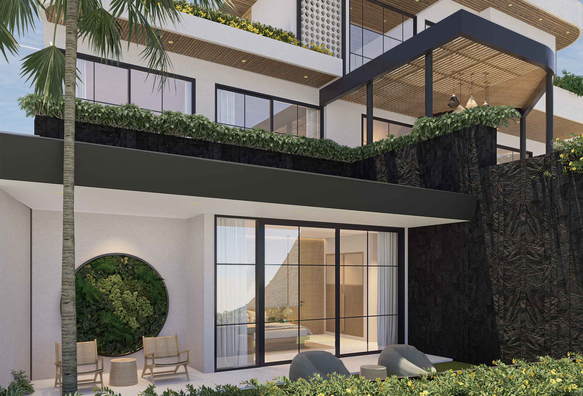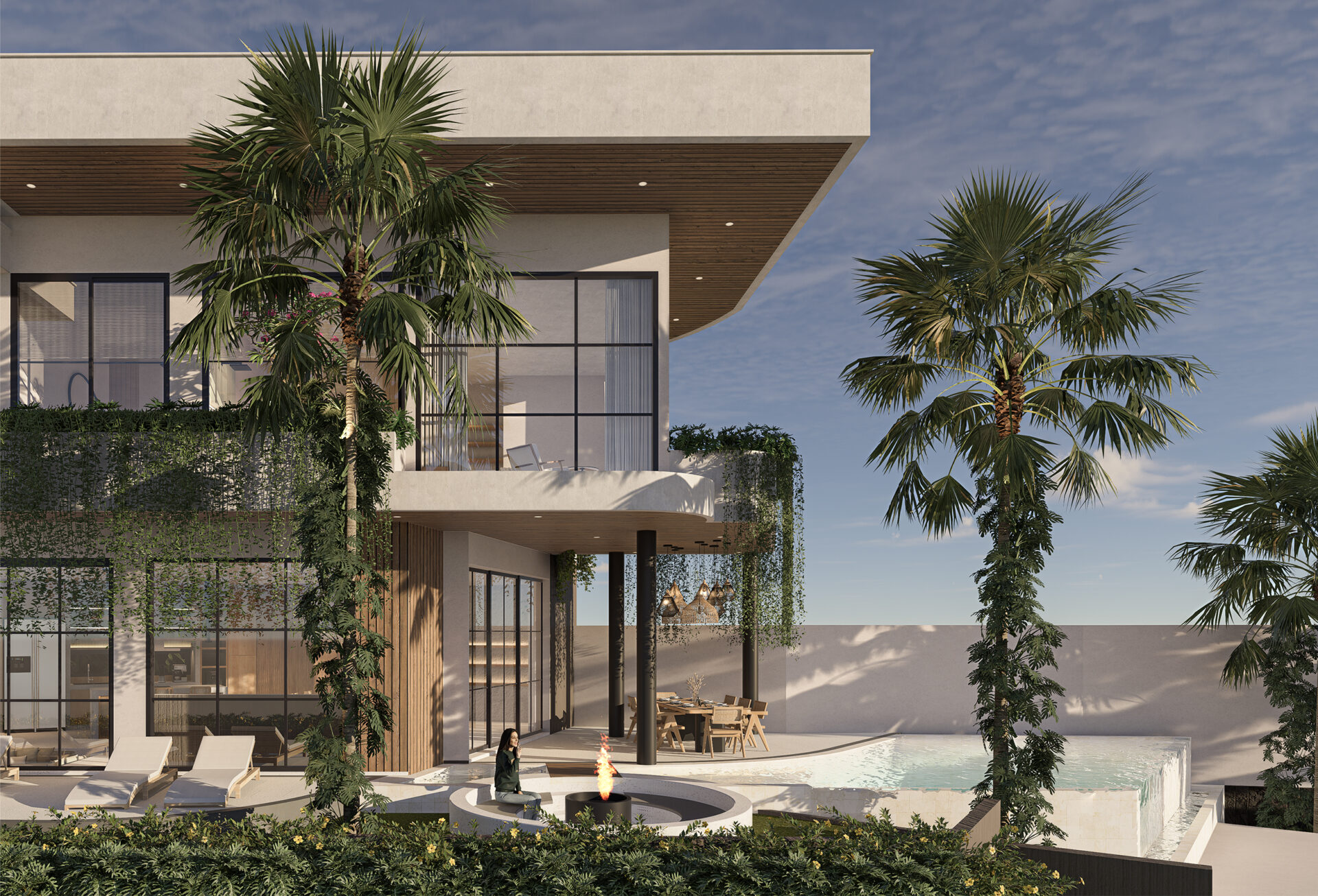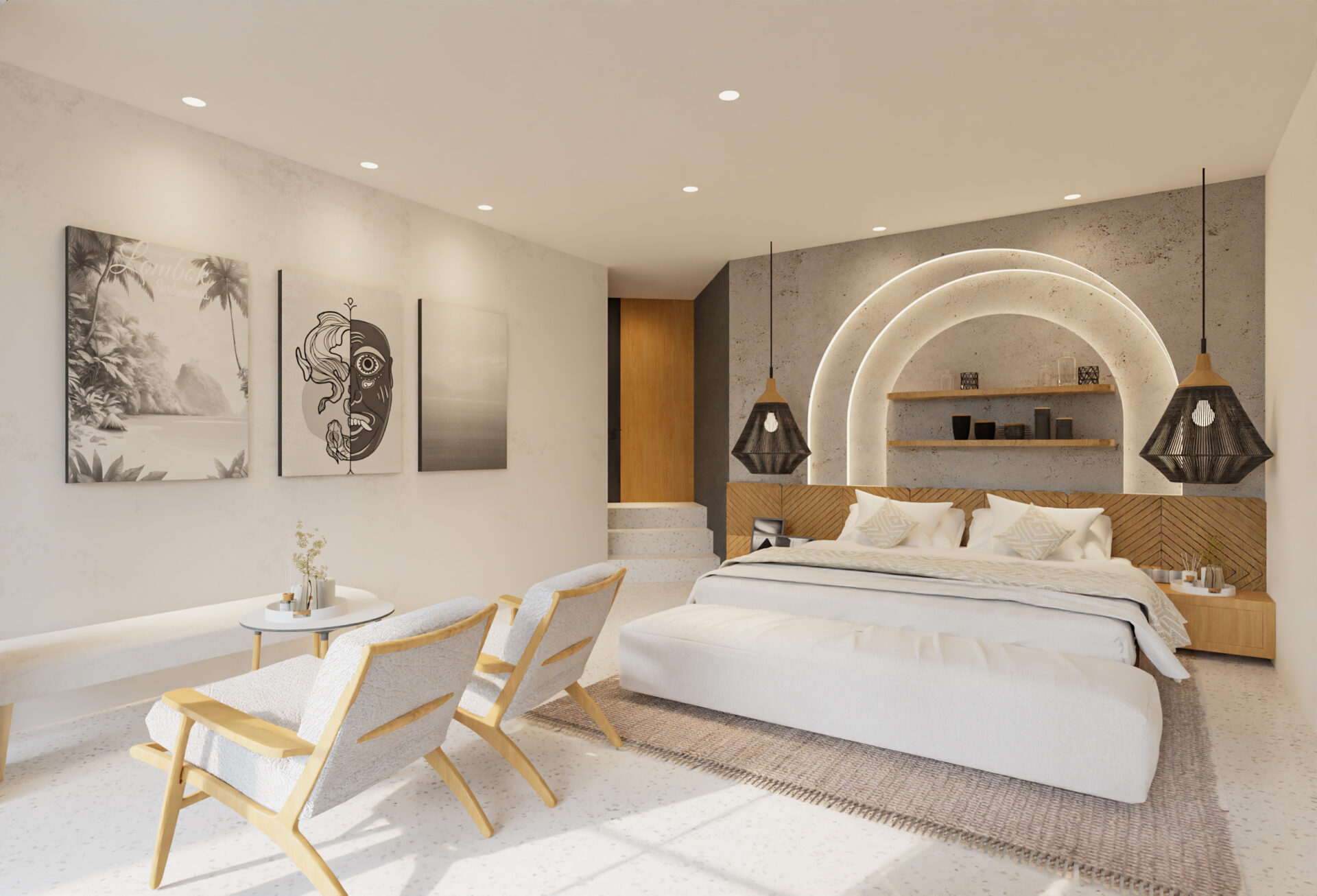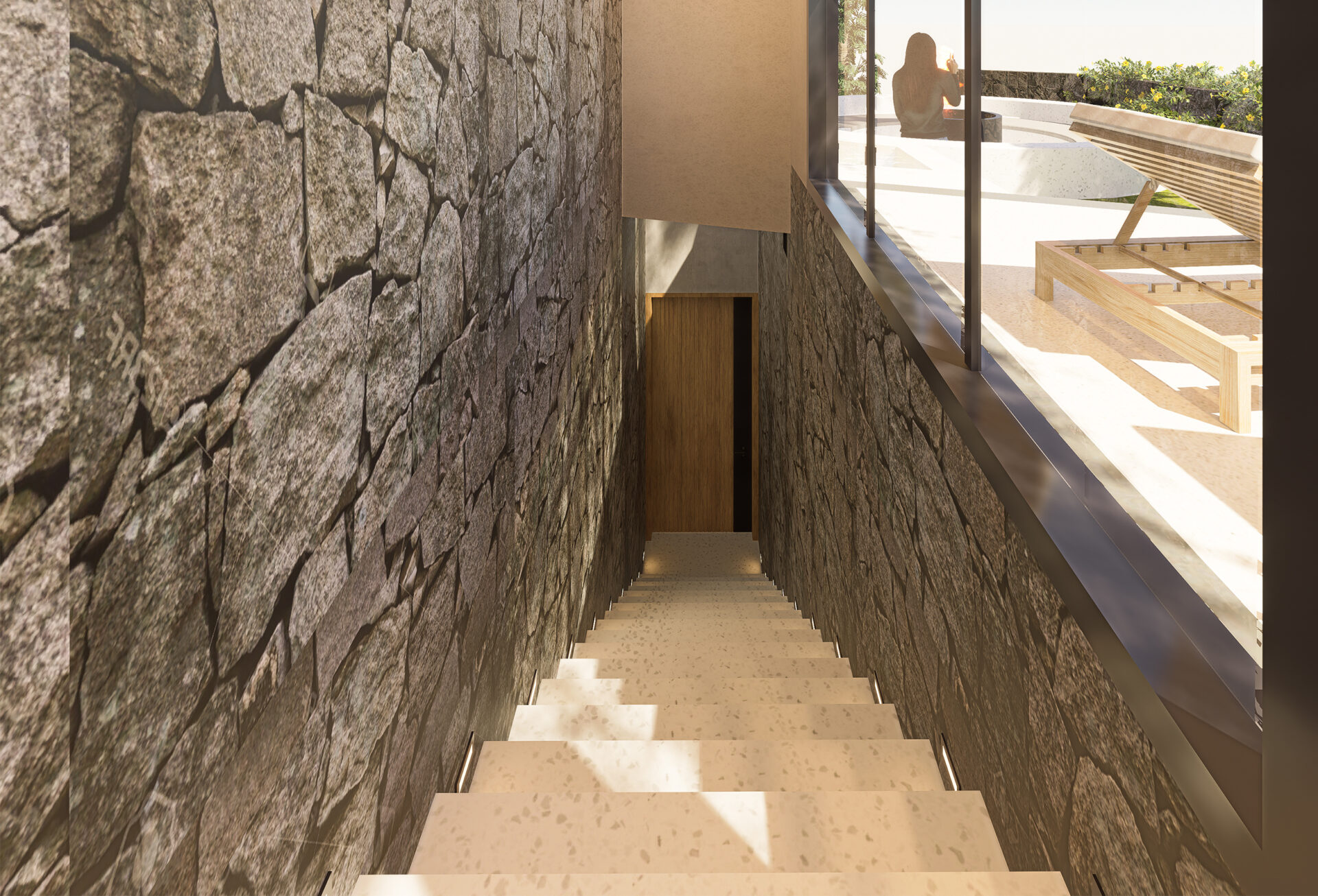 Villa 2 offers a more intimate and serene experience. Featuring three bedrooms, four bathrooms, a kitchen and dining room, two sunken lounges, and five terraces, this villa provides a peaceful and relaxing atmosphere. The design reflects minimalist elegance, inspired by the same Bauhaus architect principles, making it the perfect retreat for those seeking simplicity and comfort.