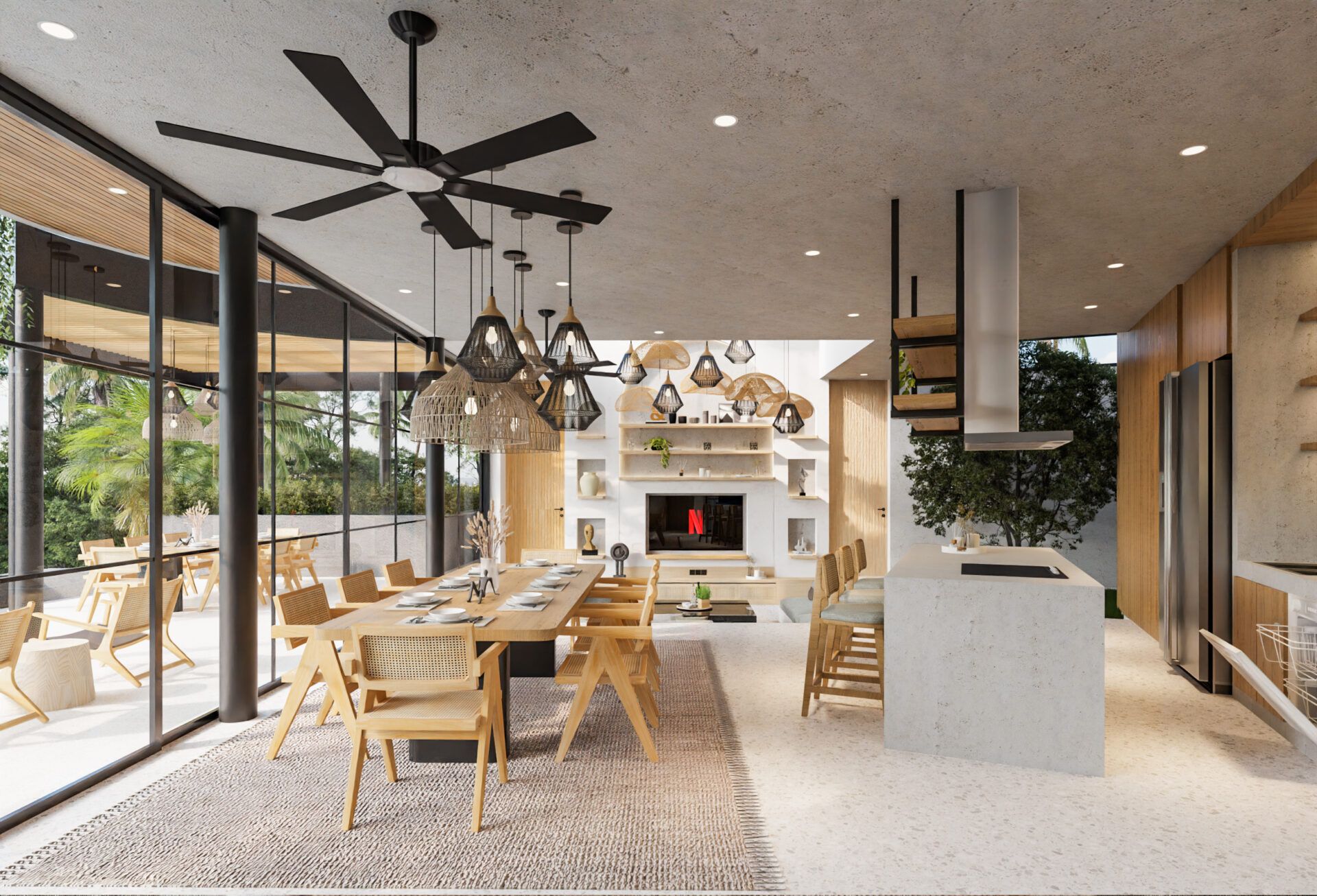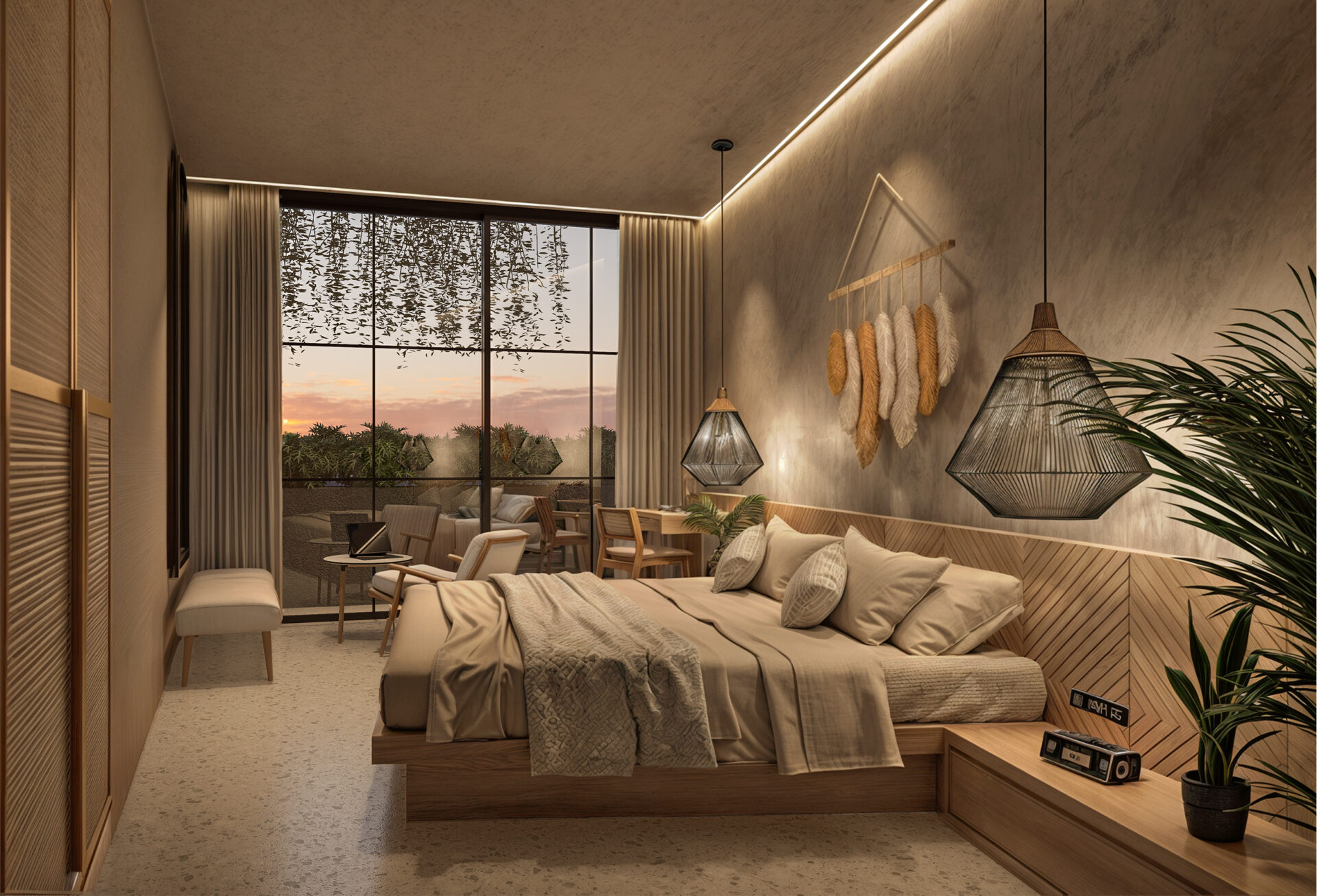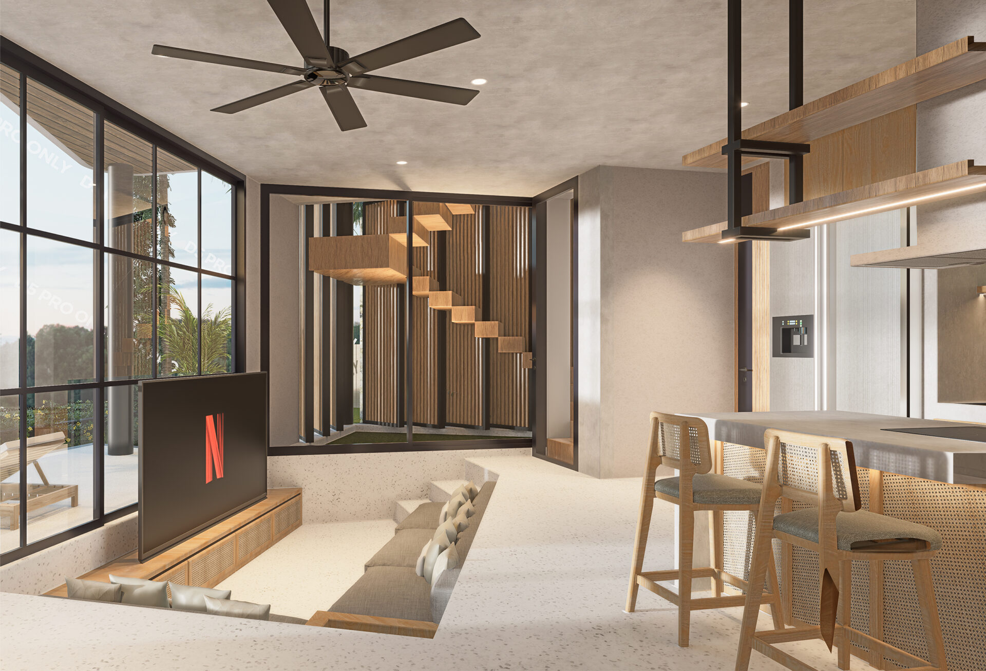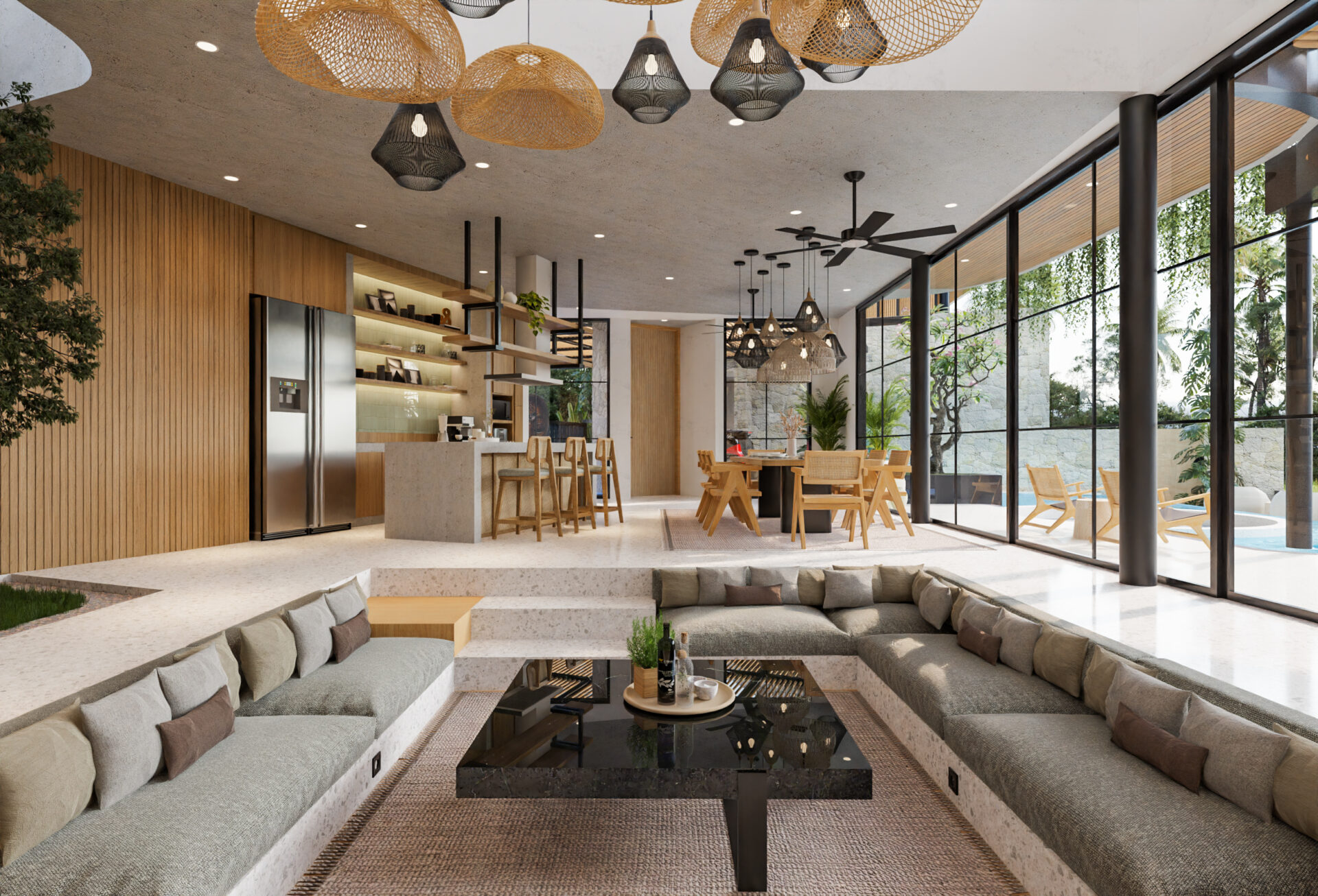 Villa 2 offers a more intimate and serene experience. Featuring three bedrooms, four bathrooms, a kitchen and dining room, two sunken lounges, and five terraces, this villa provides a peaceful and relaxing atmosphere. The design reflects minimalist elegance, inspired by the same Bauhaus architect principles, making it the perfect retreat for those seeking simplicity and comfort.
