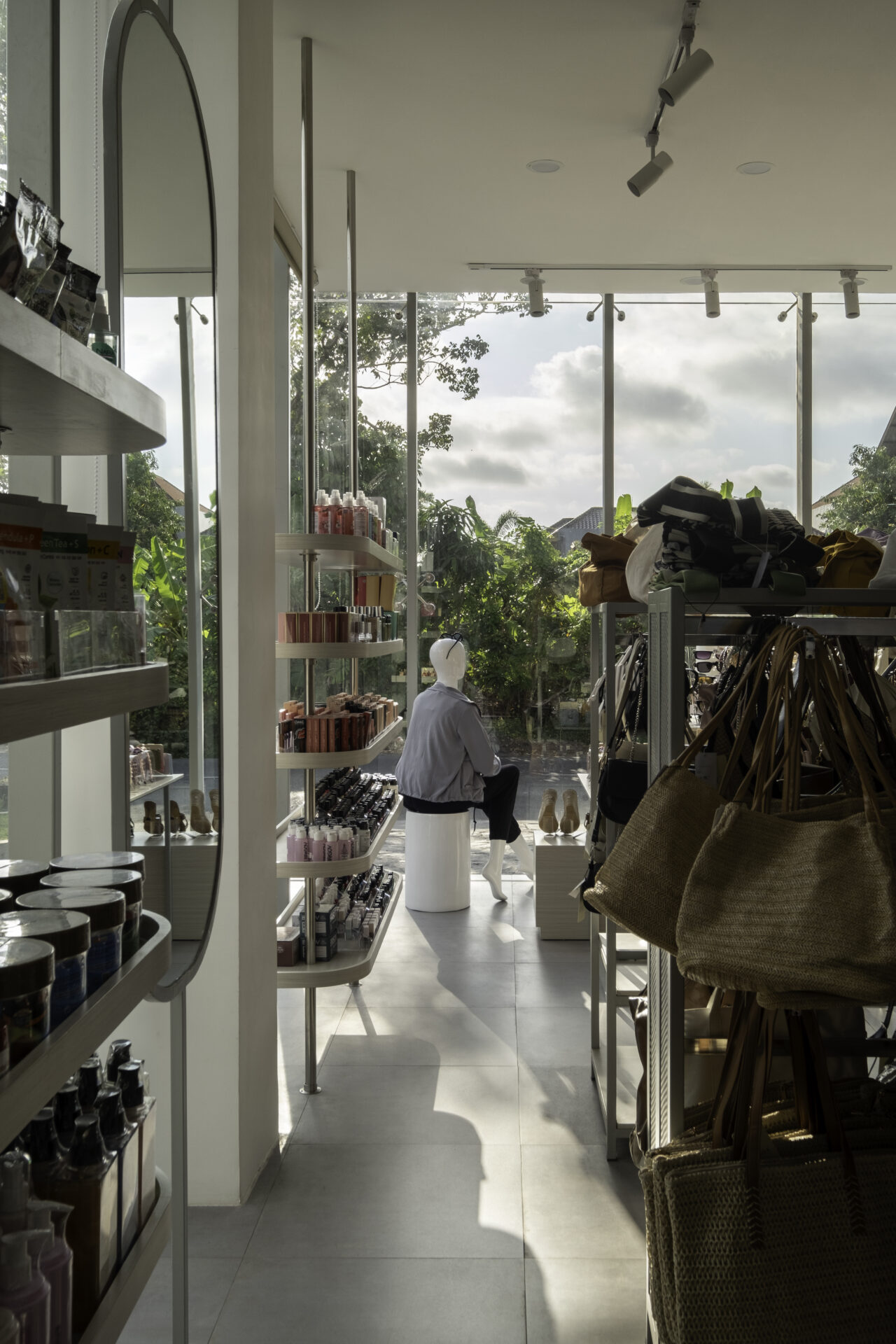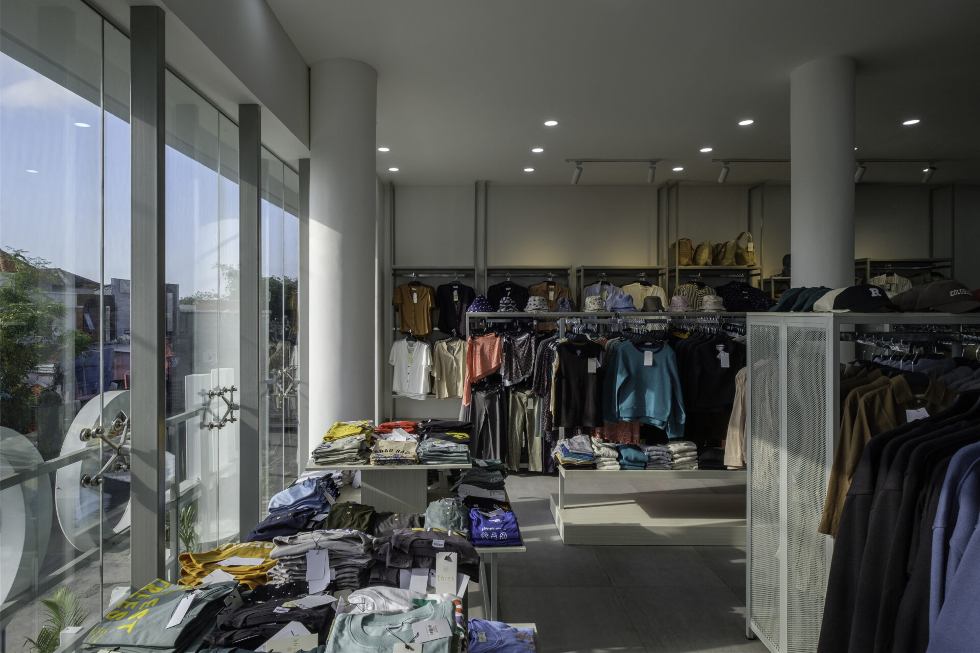 Strategic lighting plays a significant role in the design, helping to highlight the merchandise and enhance the overall ambiance of the store. Carefully placed light fixtures create focal points and draw attention to specific areas, ensuring the space remains both functional and aesthetically pleasing. The lighting is thoughtfully chosen to complement the minimalist interior design, creating a visually balanced environment.