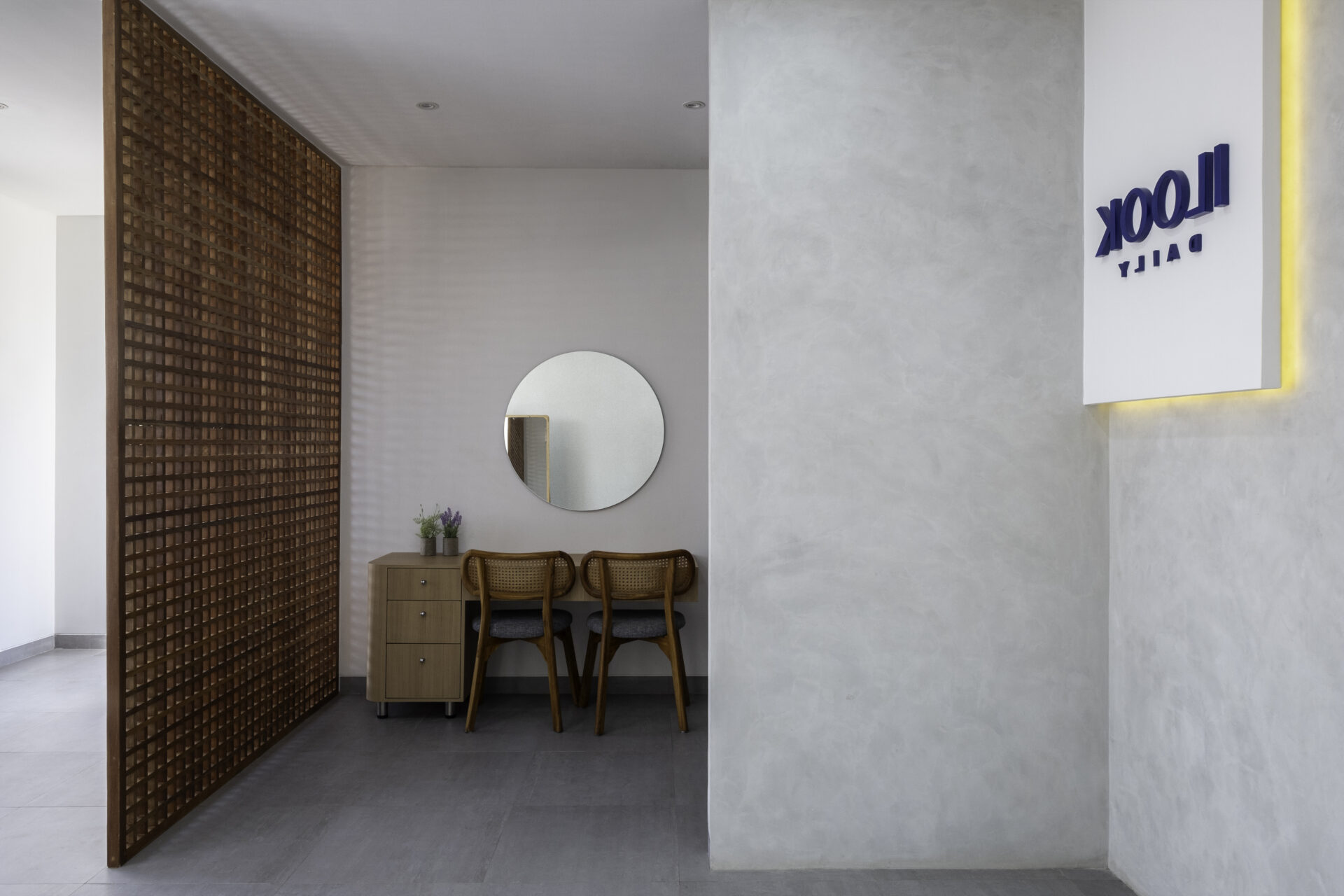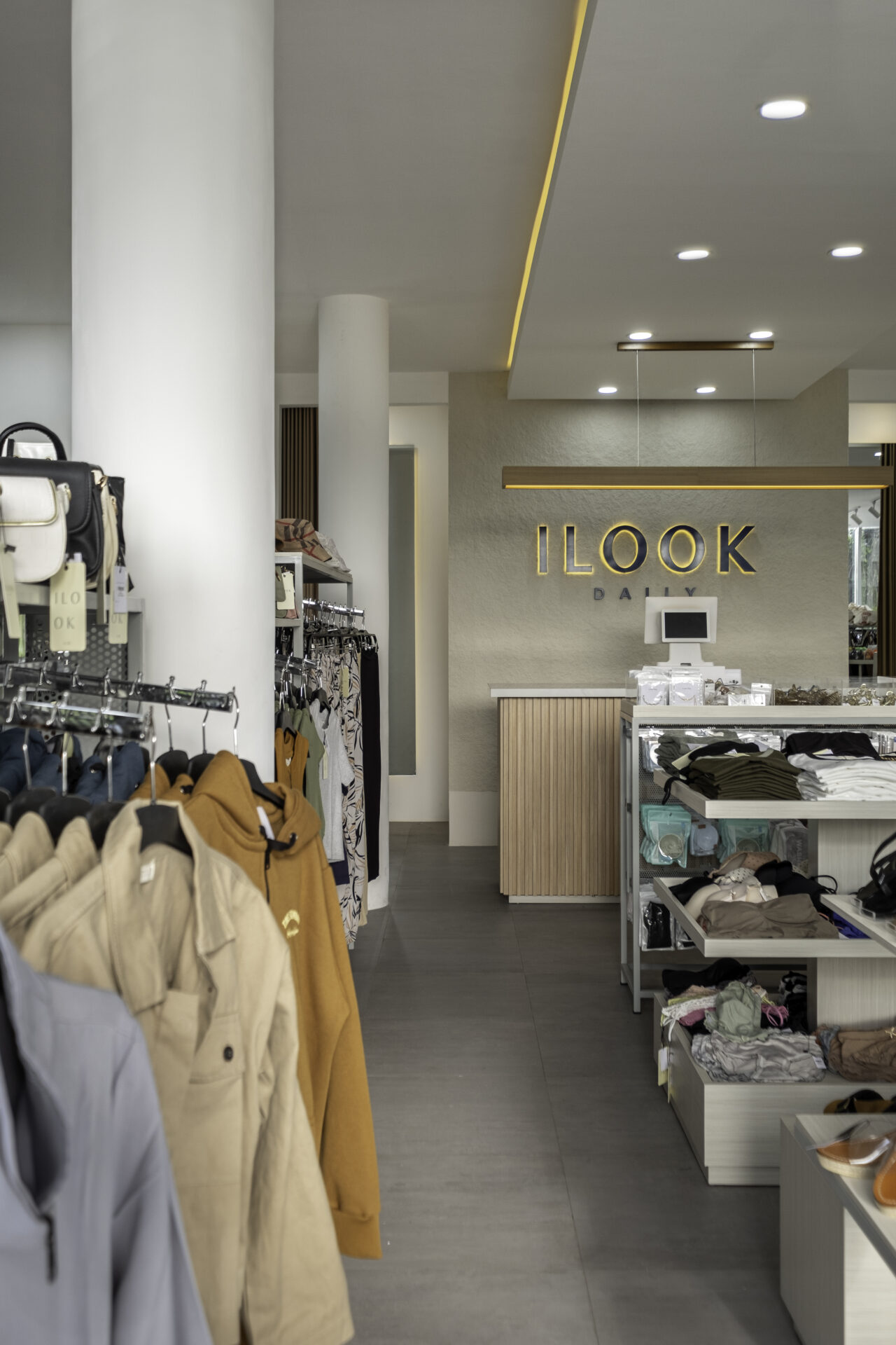 To achieve the client’s vision, the interiors incorporate warm materials, textured wall accents, and a soft beige color palette. The strategic use of lighting enhances the overall ambiance and highlights the merchandise on display, ensuring an ideal shopping experience. With a layout that includes a display area, four fitting rooms, a warehouse, and a toilet, the design harmonizes functionality with aesthetic appeal, making it a sophisticated and welcoming space for customers.