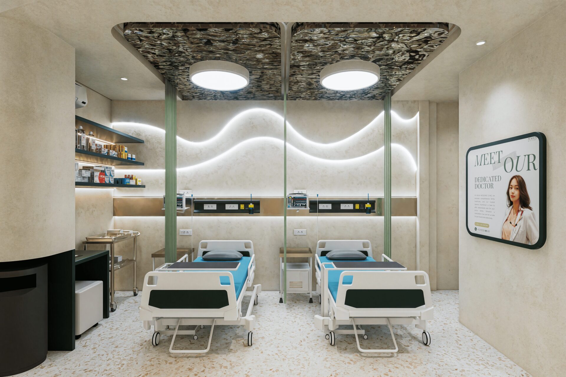 Within its intimate 80 m² layout, the clinic balances efficiency with warmth. In this biomorphic architecture, every space - from the Front Office & Pharmacy to the Doctor Consultation Room and Recovery Area is designed for privacy, clarity, and comfort.